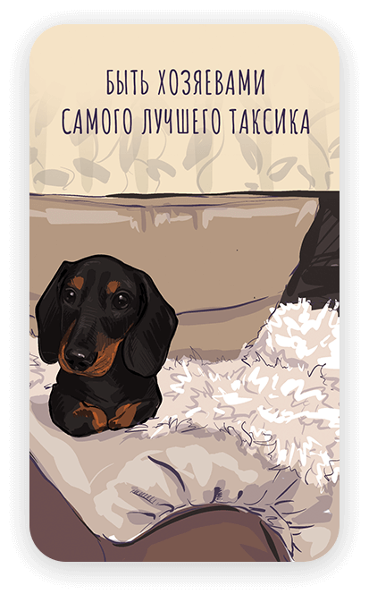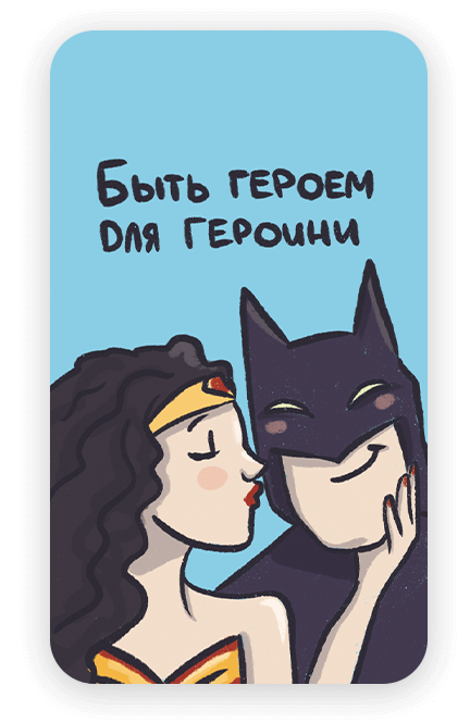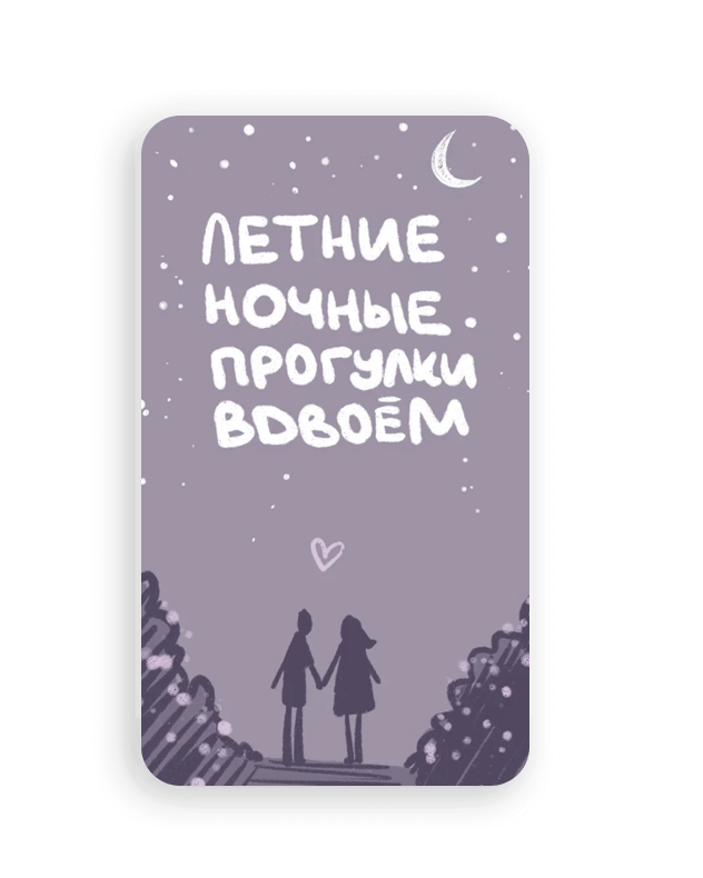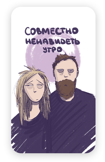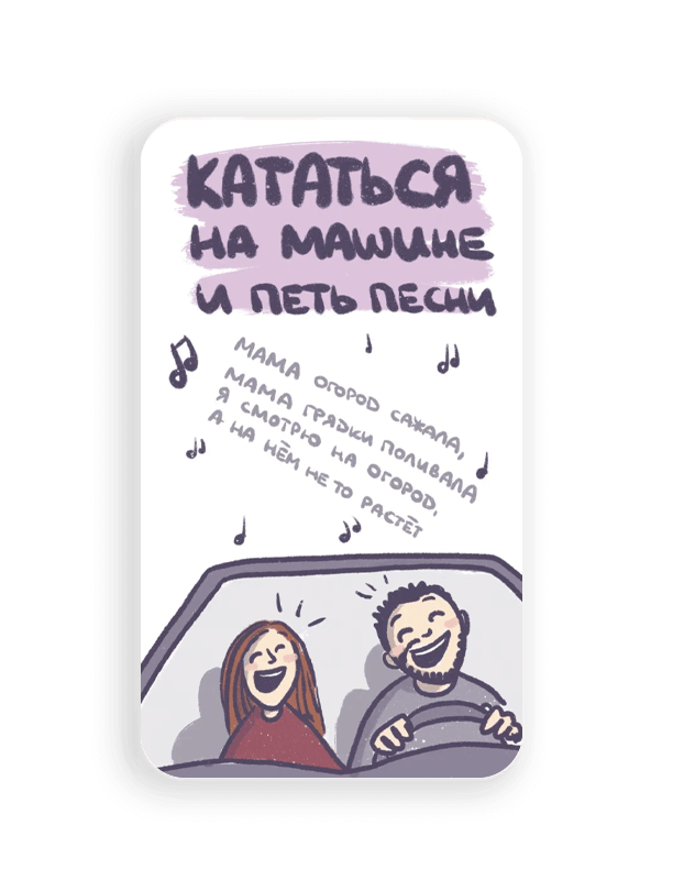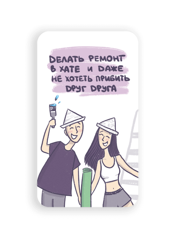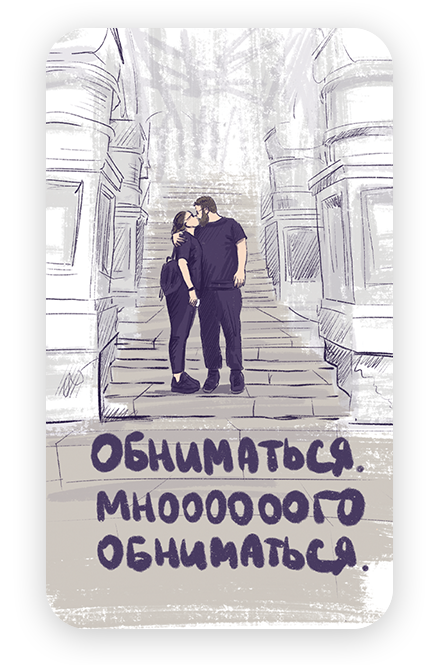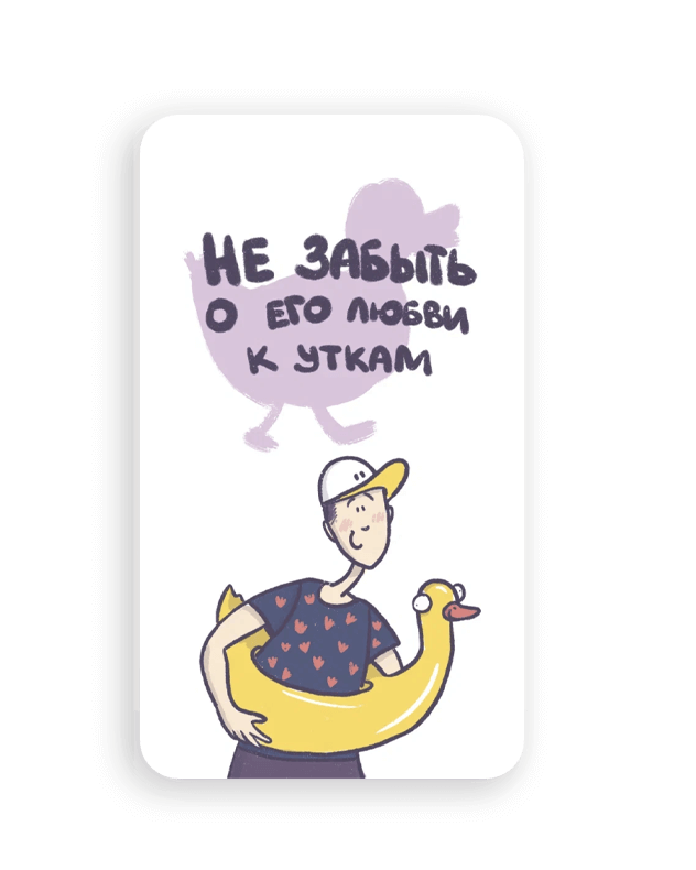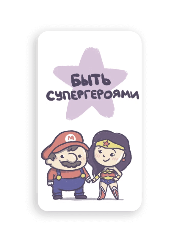 Маринэ, привет! Я все забываю написать тебе отзыв. В общем, я была в восторге и переживала, что Артёму не понравится или он отнесётся к этому «сквозь глаза». Но я не ожидала такой реально искренней от него реакции, как он смотрел и смеялся над карточками! Он сказал, что ему очень понравилось и карточки очень прикольные! Он обратил внимание, что в карточках цвет нашего белья постельного, сказал, что мы похожи, и что они классные)