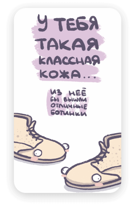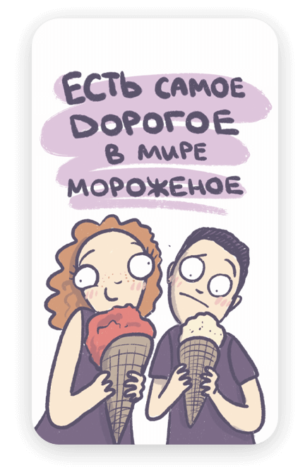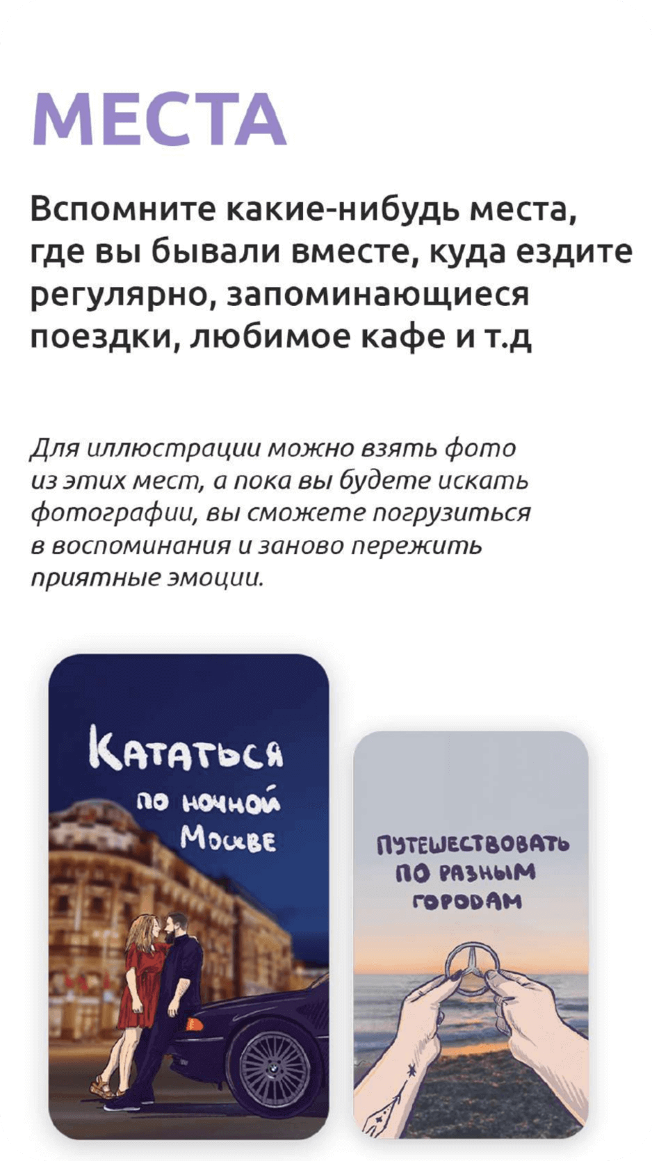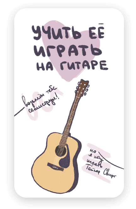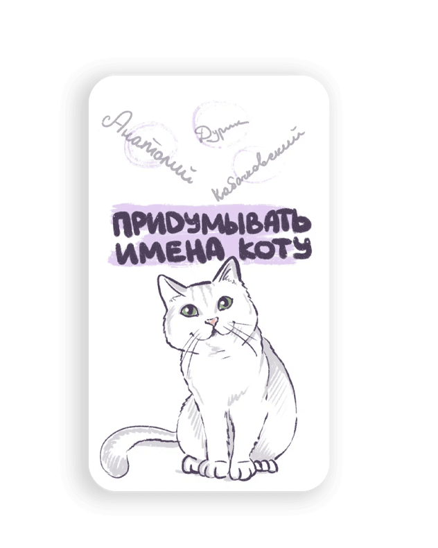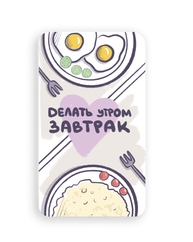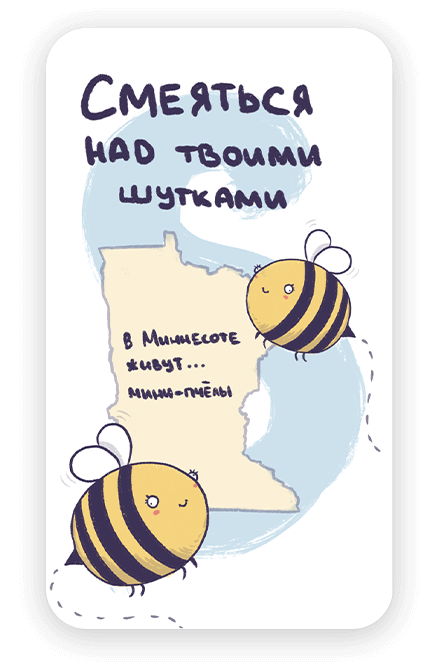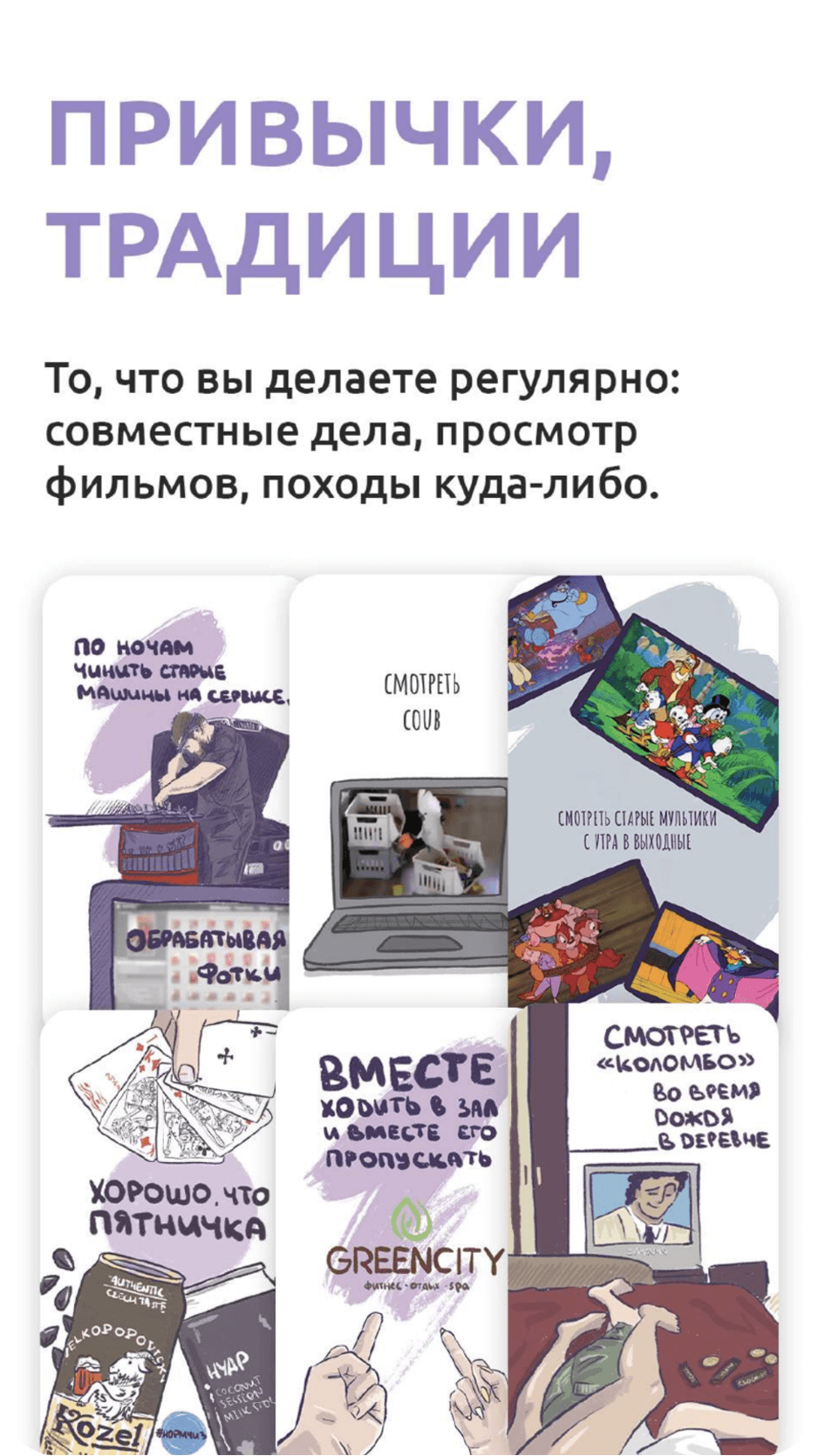 Маринэ, привет! Я все забываю написать тебе отзыв. В общем, я была в восторге и переживала, что Артёму не понравится или он отнесётся к этому «сквозь глаза». Но я не ожидала такой реально искренней от него реакции, как он смотрел и смеялся над карточками! Он сказал, что ему очень понравилось и карточки очень прикольные! Он обратил внимание, что в карточках цвет нашего белья постельного, сказал, что мы похожи, и что они классные)